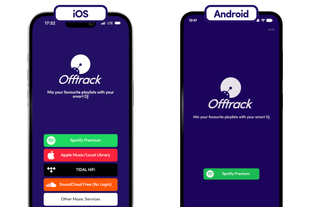 The Offtrack AI DJ app works with Spotify, SoundCloud Free, Apple Music or TIDAL. It’s easy and seamless – Offtrack (formerly Mixonset) can start a party just for you wherever you go.